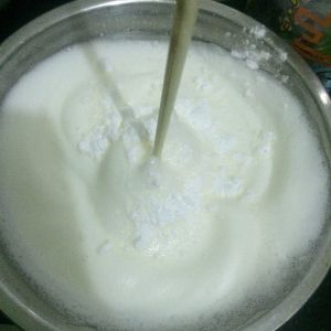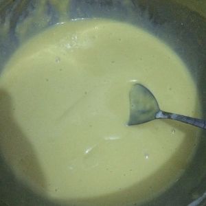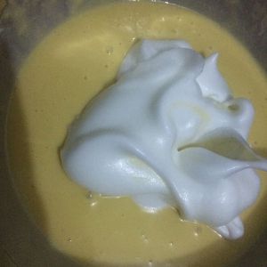 都搅拌后,打好的蛋液分三次加入蛋黄中。要搅拌均匀。(如果搅拌的过程中太稀太稀了就加点面粉进入变成如图,太稀会导致蛋糕不蓬松)