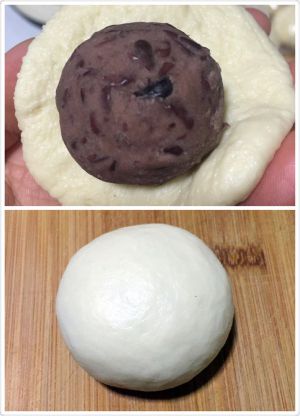 取一个静置好的小面团按扁,包入红豆馅,收口捏紧朝下放置。