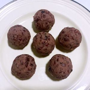 红豆沙平均分成六份,捏圆备用。(红豆沙是自制的,我在中间包入了少许蜜豆,增加口感,也可以直接用买的红豆沙)