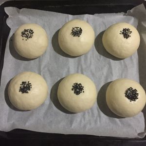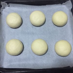 依次做好六个,摆入铺了油纸的烤盘,放温暖湿润处二次发酵。