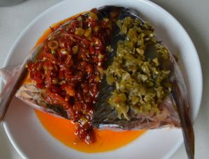 鱼头摆盘,一边放红剁椒、一边放绿剁椒