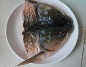鱼头洗净切开加料酒 盐 腌制15分钟 将小米椒、蒜瓣切碎备用