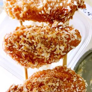 所有调料拌匀后腌制鸡翅一小时以上,拿出后裹面包屑