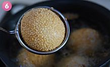 炸的时候,油温约6成热的时候,放入麻团。要小火慢炸。待麻团慢慢漂浮起来后即可捞出。