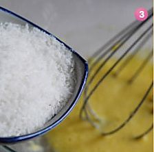 加入一半左右的全蛋液搅打均匀后,再加入椰蓉拌匀。