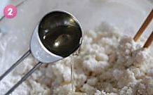 200ml的清水加热至微温后,放入白砂糖,搅拌融化。然后把融化后的糖水分次加入到糯米粉中,一边加水一边搅拌。再加入30ml的玉米油,把面揉成光滑的面团。