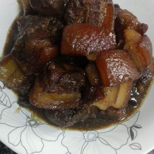 把五花肉切小块,抄熟。忘记拍照了,请见谅。