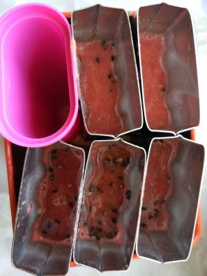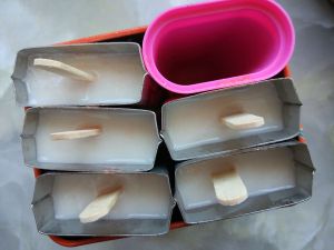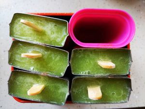 过滤后倒入模具。因为我用的不锈钢雪糕模具没有支撑的外壳,所以放在一个盒子里,就能保持直立状态了