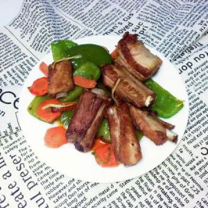 将排骨放入.继续翻炒.在加适量盐和鸡精翻炒均匀即可