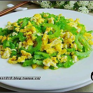 热油炒苦瓜,爆炒五分钟加入鸡蛋加味精盐爆炒。装盘