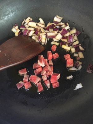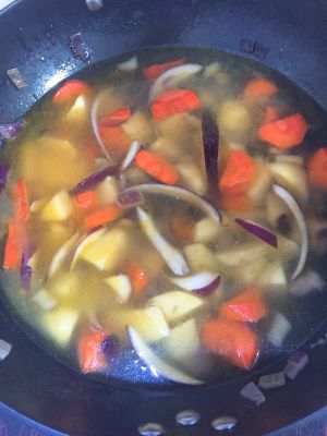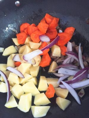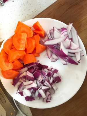 胡萝卜切块,洋葱切小块或者小碎,再切一些洋葱条。因为我太喜欢吃洋葱了