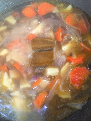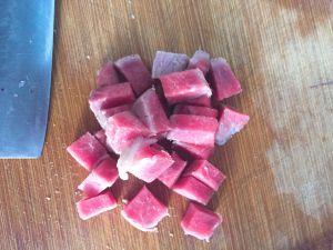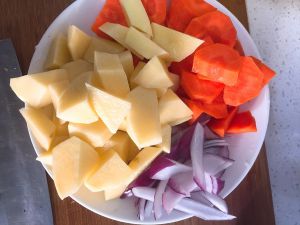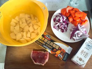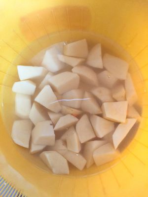 土豆切块,放入清水里,可以洗掉多余的淀粉。