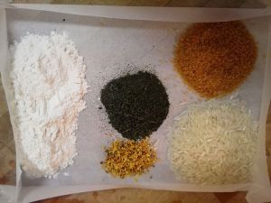 熏制的粉末:茶叶末(红茶,绿茶都可以)一汤匙,糖一汤匙(砂糖,红糖,黄糖都可以,给鸡上糖色),面粉2汤匙(面粉生烟,调节面粉的量,可以调节烟量,不要太多,不然会有苦味),大米一汤匙(米可以吸附烟中的苦味),这次还放了一点干桂花,增加一点香味。