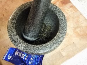 如果不是用茶包,而是整茶叶,需要将茶叶放在石臼中磨成粉末。