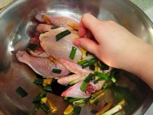 将鸡放入,用手拿葱姜在鸡上及腹腔内反复搓擦酱汁,让葱姜酱汁均匀浸在鸡上,搓几分钟,然后将鸡放入盘中腌制2个小时。