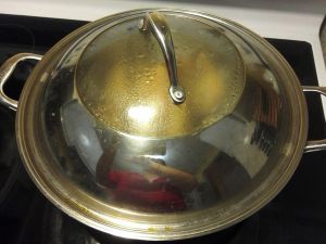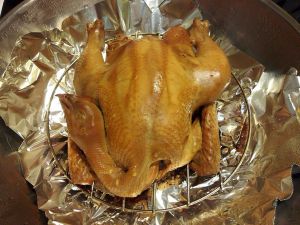 盖盖,大火开始加热,这时需要观察烟的颜色。一开始是白色的烟,这时烟里主要是雾水。要一直等到烟变成黄色,再继续加热1-2分钟,关火,将鸡闷在锅里20-30分钟。这个时间的长短可以自己调节,时间长,烟熏味就浓。