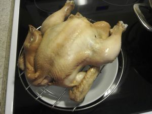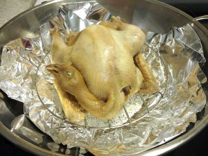 取出鸡,在鸡身上抹一层麻油,不喜欢麻油味道的,涂一层色拉油也行,鸡会更香,放凉后也不会风干。