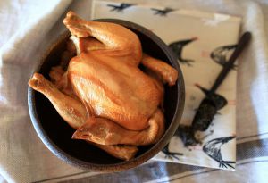成品,浓郁的烟熏味道里有淡淡的茶味,可以整鸡撕着吃。