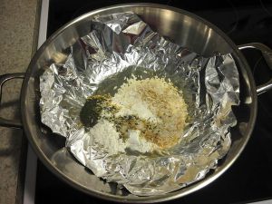 熏鸡用的锅,用铁锅最好。花花用的是不锈钢锅,用不锈钢锅如果锅底不够厚,容易烧黄锅底,不好清洗。但是一定不要用有涂层的不粘锅(涂层不能持续空锅加热)。在锅里铺上一张锡纸,将熏料放入,略混合下