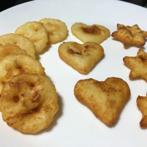 把和好的土豆和淀粉擀平,薄厚适中,用圆形模具扣出,再用筷子和小勺搞出眼睛和嘴巴