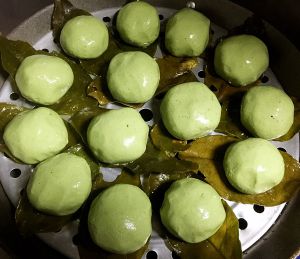 柚子叶用开水煮软后捞出,上面抹上一点油,取一块面团,包入馅料,做成团子,手上抹点油,把团子在手上滚一圈,让团子都裹上油,这样蒸出来的团子就不会粘在柚子叶上了。这里顺便说一下垫在下面的柚子叶,我的是以前摘的柚子叶,晾晒干后用食品袋装好,到用的时候直接拿出来用开水煮一下就软了,洗干净就可以用了,如果你们没有,直接去采摘新鲜的柚子叶拿回来洗干净就用是最好的,因为上面有柚子叶的清香,也可以用粽子叶煎成小段,但是一定要记得抹油!