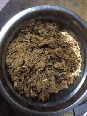 把切好的红糖放入碗中。再加入炒好的的黑芝麻,也用刀压碎。