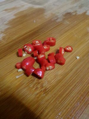 辣椒切粒,这里用的是新鲜的小红尖椒,一般两根就够了。喜欢辣的童鞋可以多放一点。