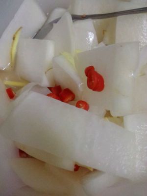 稍等几分钟后把姜丝,辣椒,放进去,加白糖和米醋拌匀,密封后等它入味就可以吃啦
