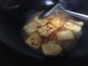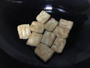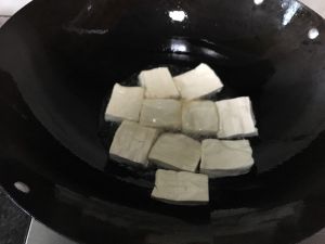 豆腐需调整位置,因为不是平底锅,受热不均匀。