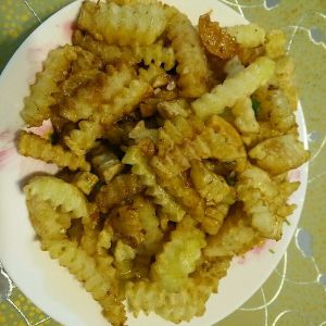 另起锅,加少量油,油热放生抽、盐、醋适量,加三四汤匙水,再加适量白糖,熬至粘稠,下炸好土豆条,快速轻拌,使土豆条均匀粘上汤汁,最后放葱、蒜末,撒孜然出锅,味道棒极了。