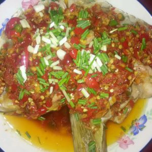 将炒好的调料酱连油淋在鱼头上,撒上葱花