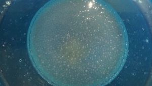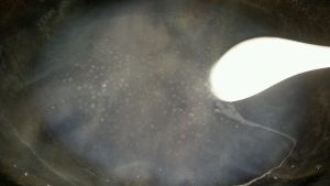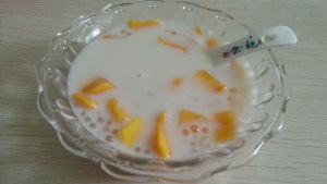 沸水西米下锅,一直搅拌,煮到只看见有小白点关火,焖五分钟,就是现在这样了。