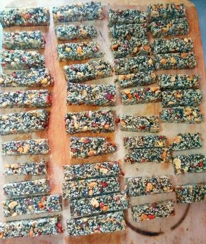 稍微冷却后,将压制好的芝麻饼切成小块,这里注意不要完全冷却,不然很难切的。