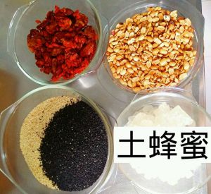 黑白芝麻,红枣,枸杞,花生米分别炒熟待用,因为这个甜点跟上一个食谱一样,第四碗当时用的冰糖。这个膏得用蜂蜜,忘记拍照,用文字示意一下。