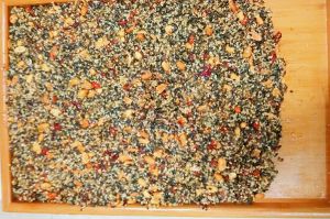 将搅拌好的食材趁热倒入一个容器用饭勺或者其他扁平工具压紧。(我用的是一个竹制茶盘容器)