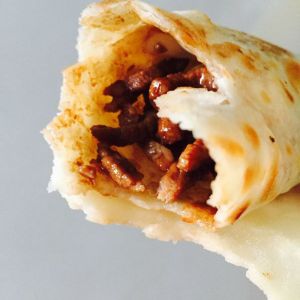 面饼煎好后,放入京酱肉丝卷成肉卷。