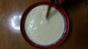 把:面粉,鸡蛋,鲜奶,搅拌均匀(本人条件艰苦,有气泡,谅解)