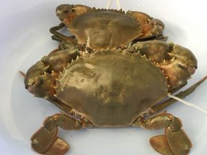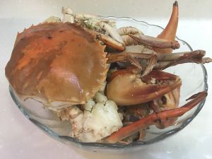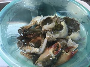 切块,将内脏掏空,洗净,将蟹钳敲碎。停干水备用。