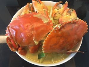 再加入适量的水煮沸至土豆变绵,再放入咖喱(剩下的5小块全放)、蟹块、大葱、柠檬叶丝、椰浆(一罐)煮沸,加入适量的淡奶煮大约3分钟,至蟹完成熟即可。
