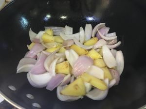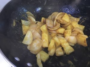 另起锅,将洋葱、豆土块翻炒,至洋葱变半透明状,土豆变金黄。