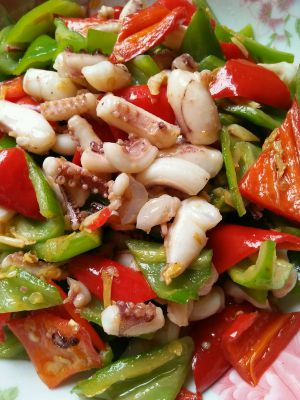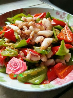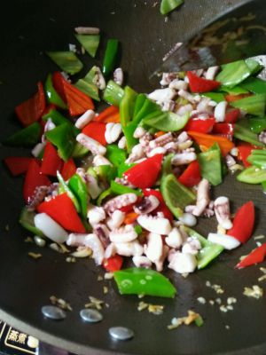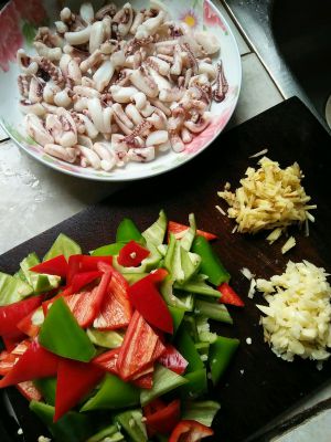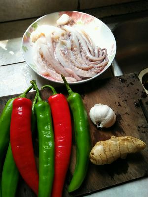 鱿鱼须切长段过开水,辣椒切块,姜.蒜切末