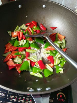 热锅凉油,爆香姜蒜末,然后放辣椒,炒至6成熟,放盐