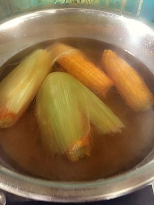 煮的途中翻翻玉米,大概煮了40分钟,关火,可以在多煮一会。
