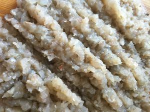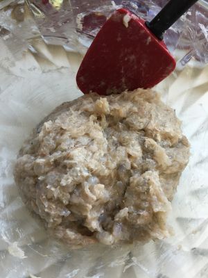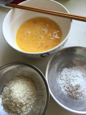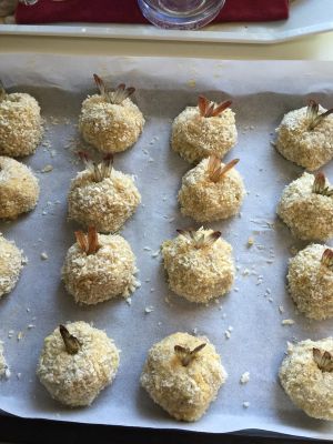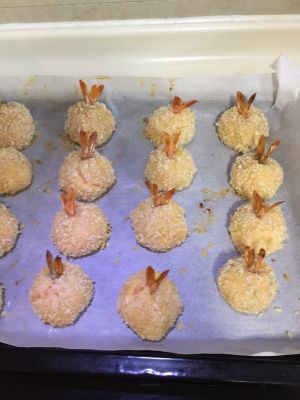 取一点虾泥包上芝士,放到生粉的碗里裹上生粉后放到蛋液里沾满蛋液,最后裹上面包糠,放到烤盘中,把虾尾巴插到虾球上装饰一下(包的过程没有拍照)