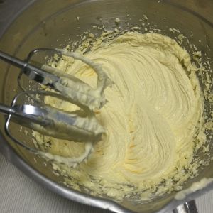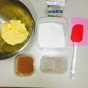 将糖粉倒入软化好的黄油,打至顺滑状态
