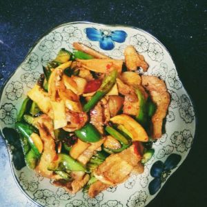 加入青椒翻炒(也可用蒜苗替代,变成蒜苗回锅肉),撒盐,起锅。