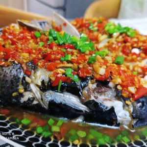 准备一个碗,两大勺剁椒,喜欢辣就三大勺,然后加入适量的白糖,生抽,料酒,食用油,拌匀后用勺子舀到鱼头上,隔水蒸12分钟,出锅撒葱花,浇热油就好了