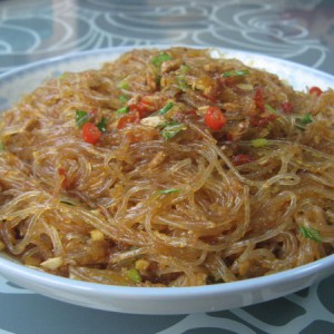 然后再放油,爆炒姜蒜末,加入豆瓣酱炒香,然后放入肉末炒至变色,然后放入料酒,加开水,下粉丝,放酱油,微火煮到收汁为止。最后放入葱末、味精即可盛盘。