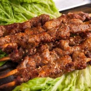 2竹莶堤前用水泡透,将腌制好的羊肉块,用竹莶串好。