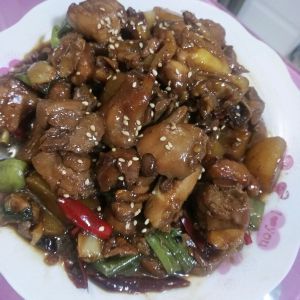 锅内倒油,5成热下葱,姜,蒜,干辣椒炒出香味放入鸡肉,炒5-8分钟左右,放酱油,老抽,料酒,盐,耗油翻炒均匀,把土豆,杭椒,小红椒放入锅中翻炒2分钟。